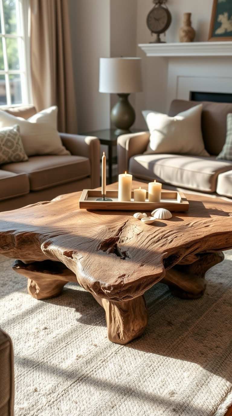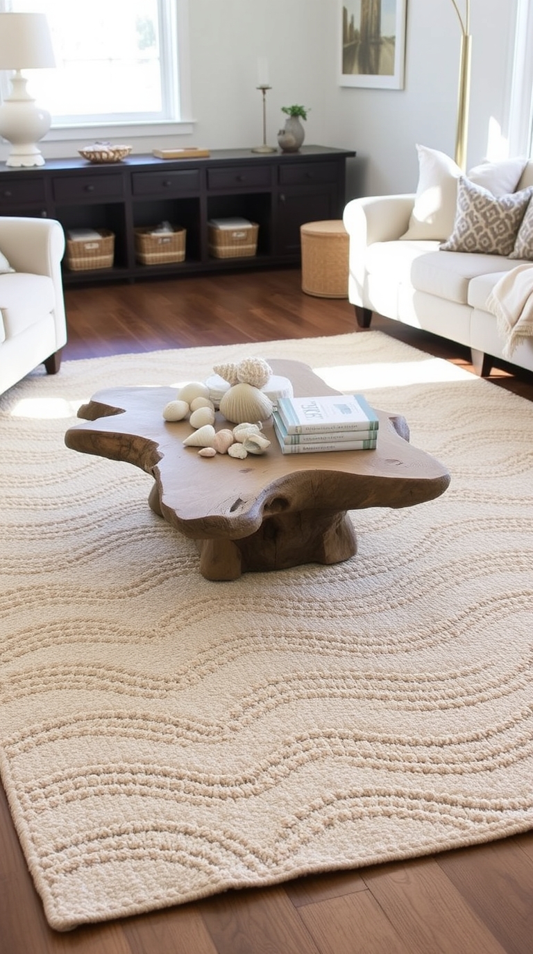 A driftwood coffee table brings an organic, earthy element to your living space. Its unique design adds character and creates a focal point that resonates with the beach theme. This centerpiece can inspire conversations and shared laughter as you unwind with family and friends over warm drinks and snacks.