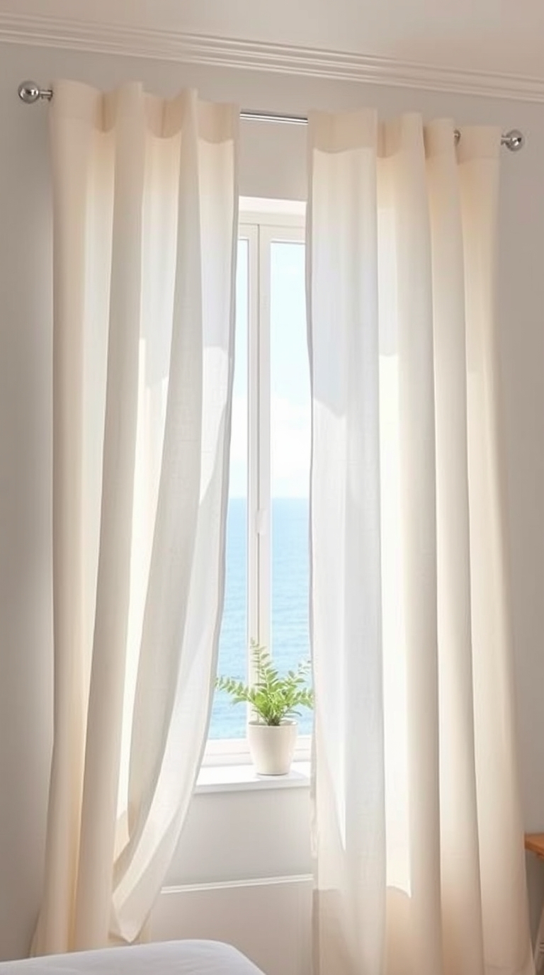 Soft linen curtains offer a breezy feel that enhances natural light while providing privacy. Their airy fabric sways gently with the ocean breeze, creating a serene atmosphere in your home. Light-filtering curtains help maintain a relaxed vibe and can soften direct sunlight, transforming your space into a warm sanctuary.