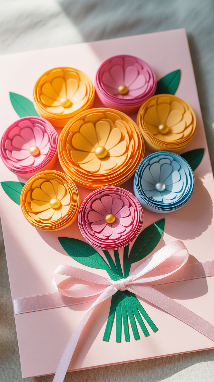 Picture this: a bright and cheerful bouquet of flowers made from vibrant colored paper, nestled on a soft pastel card base. The sunlight catches the textures of each flower, showcasing their lively colors against the elegant backdrop. A simple ribbon ties the card closed, adding a lovely detail. The mood? Joyful.