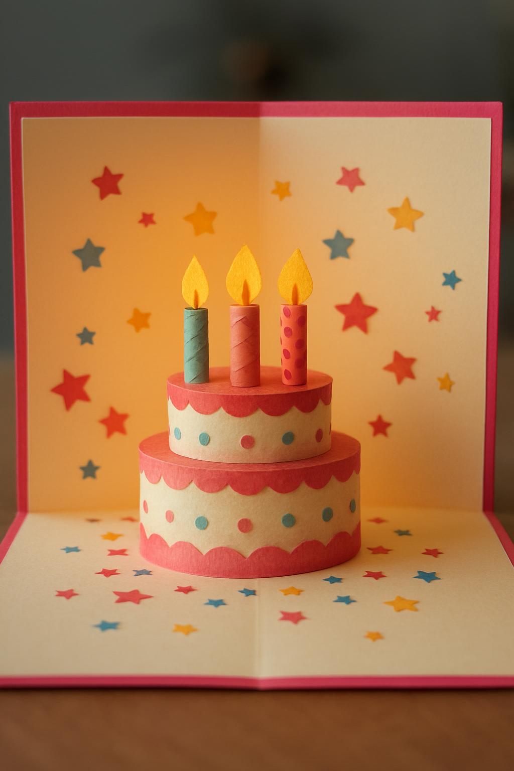 Picture this: a whimsical pop-up design springs to life as the card opens, revealing a sweet cake decorated with colorful icing. The washi tape adds a fun flair, and the light reflects off the paper’s glossy finish. Lively colors invite smiles and warmth, creating an atmosphere filled with love and laughter. The mood? Playful.