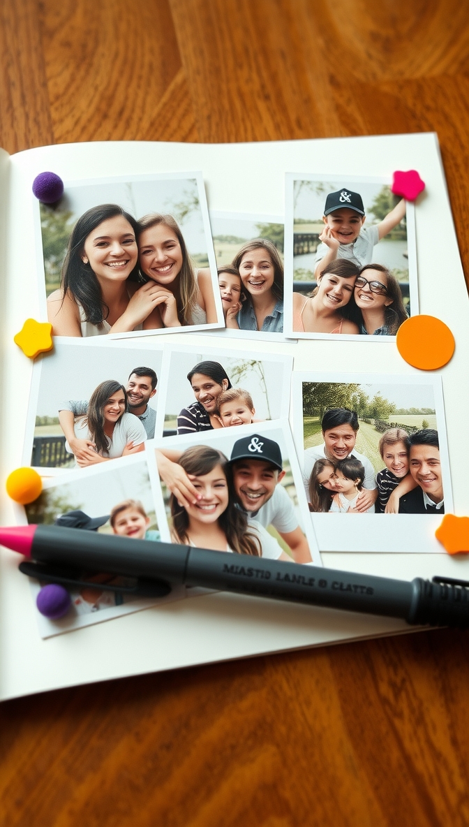 Picture this: a collection of joyful photographs arranged beautifully inside a card, with bright stickers dotting the corners. The photographs encapsulate special moments filled with laughter and love, surrounded by cheerful colors that radiate warmth. A playful pen rests beside the card, inviting heartfelt notes. The mood? Nostalgic.