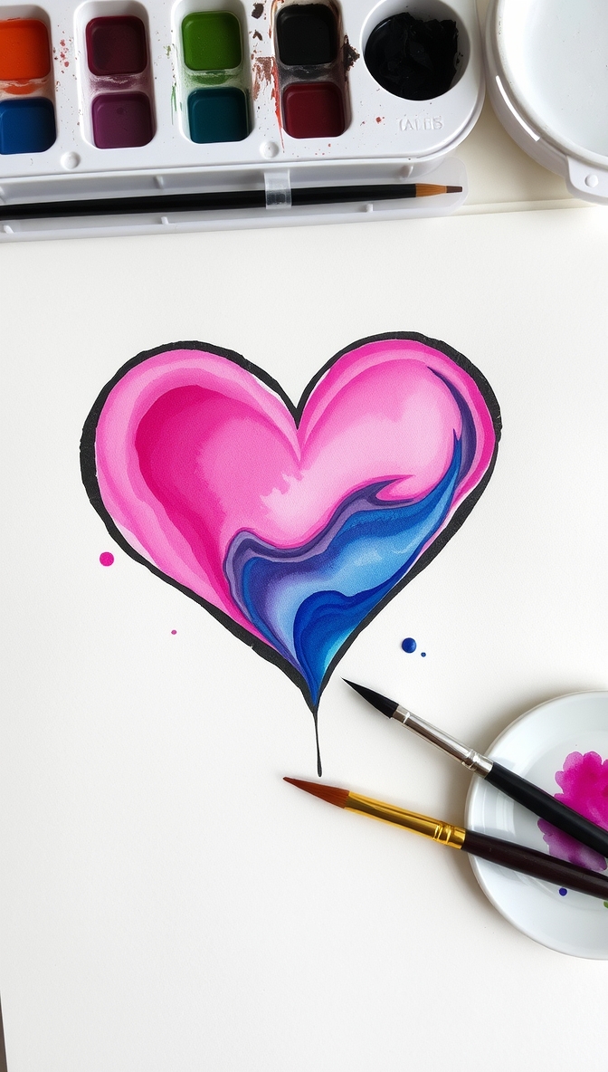 Picture this: a vibrant heart, painted in swirling hues of pink, purple, and blue, standing out against the soft texture of watercolor paper. The bold black outline adds depth while a few droplets of color blend artistically at the edges. A brush lays beside a small palette, hinting at the creative process. The mood? Artistic.