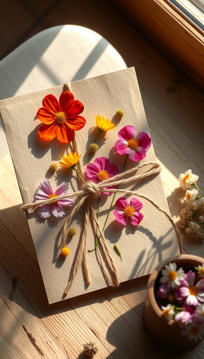 Picture this: soft kraft paper adorned with delicate pressed flowers, each petal showcasing vibrant colors and natural textures. The twine adds a rustic charm, tying the card together as sunlight filters through softly, casting a warm glow. A small pot of more pressed flowers sits nearby, inviting creativity. The mood? Serene.