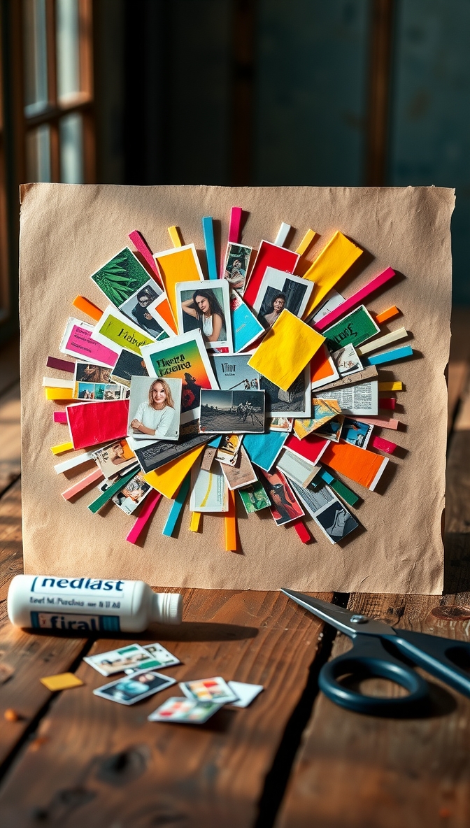 Picture this: a vibrant explosion of colors and shapes, forming an engaging collage against a sturdy cardstock backdrop. Bright magazine cutouts tell stories, while playful glue drips hint at the creative process that made it. Scissors lie nearby, accompanied by a few stray cutouts, celebrating the artistry. The mood? Expressive.